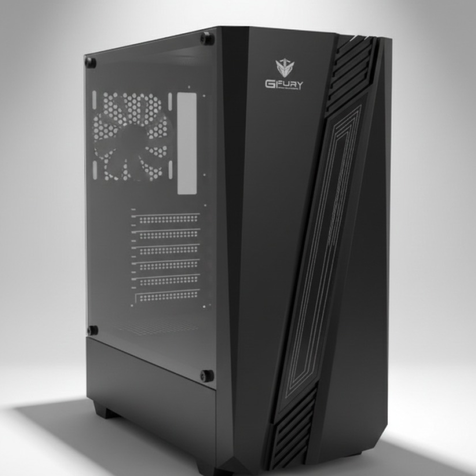 The GFury FIRE GF-120 Gaming PC Case is a sleek and compact gaming chassis designed for clean builds with a modern RGB touch. Featuring a black body with a tempered glass side panel and a stylish ARGB front strip, this case offers balanced airflow, dust protection, and essential connectivity—ideal for budget to mid-range gaming PCs.